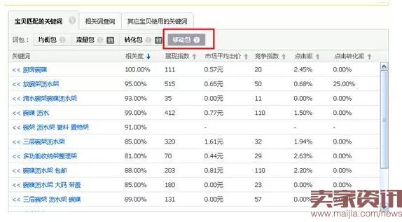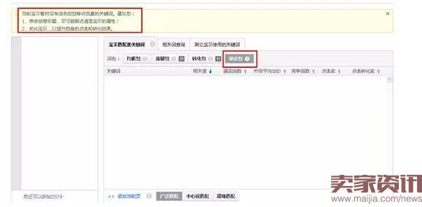 这个是最简单有效的办法,去系统推荐词,选择合适你宝贝的关键词加入,刚加入就全部带有手机标识,但有些宝贝这个移动包是没有一个关键词,如下图: