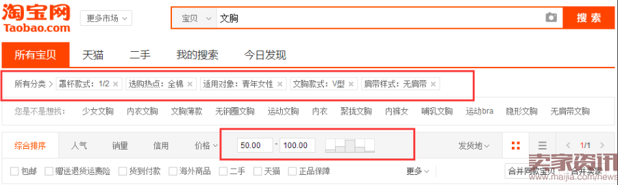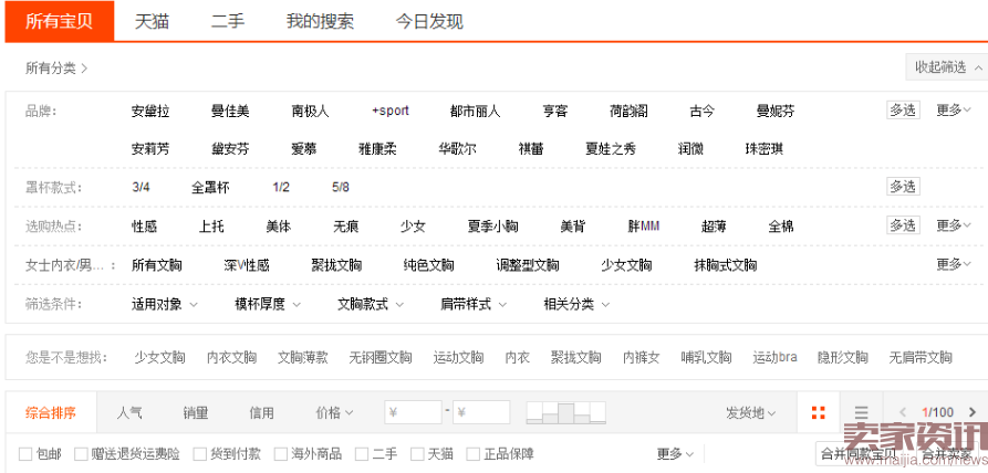 当然了,大概什么价位的,是不是只想从天猫上买!这些都可以在这里筛选!OK,你注意,每一次筛选都是在缩小竞争范围,更为重要的是,每一次筛选实际上都是在给你明确你真正的竞争对手是谁。比如,你可以根据你的产品,经过条件筛选后,得到这样的结果:1/2的罩杯款式、全棉的、适合青年女性的、V型的、无肩带、价位在50——100之间的(但是注意,我这里只是举例子,你比我要更熟悉你的产品。并且这里我的条件设置的很多,也不规范)。好了,你的竞争对手会被界定的非常明确。