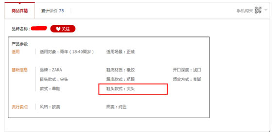 再上传宝贝的时候,会先填写宝贝的类目和属性,多数属性是淘宝已经给了的,我们去选择,比如鞋头款式这个属性,下面就有:尖头、圆头、鱼嘴、方头等等。选好并发布商品后,在前台宝贝详情处就会体现出来,如下图: