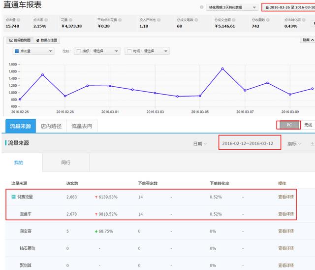 店铺是在2月26号开始推广直通车的,在26号之前店铺基本上是没有流量的,只有少部分淘宝客的流量,而且店铺的款式也是没有销量的,在26号之后店铺的流量开始慢慢的增加。